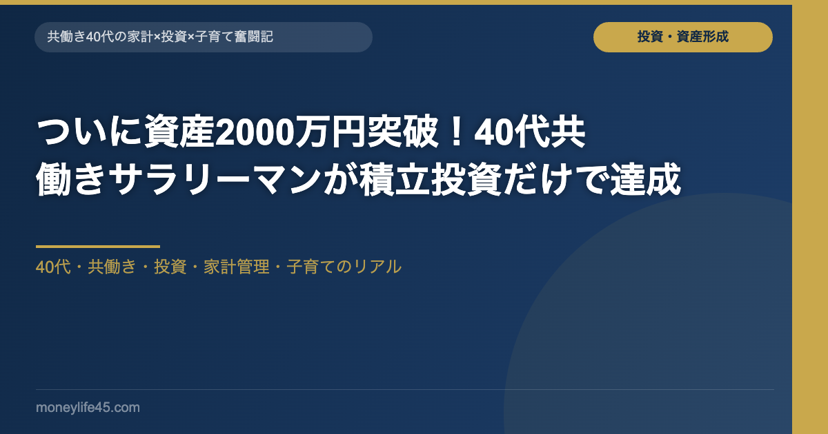 こんにちは、共働き子育て真っ最中サラリーマンのけんいちです。ついに我が家の金融資産が2,000万円を突破しました!正直、ここまで来るとは思っていませんでした。40代・住宅ローンあり・子育て中という「三重苦」とも言える状況のなかで、積立投資を続けてきた結果です。