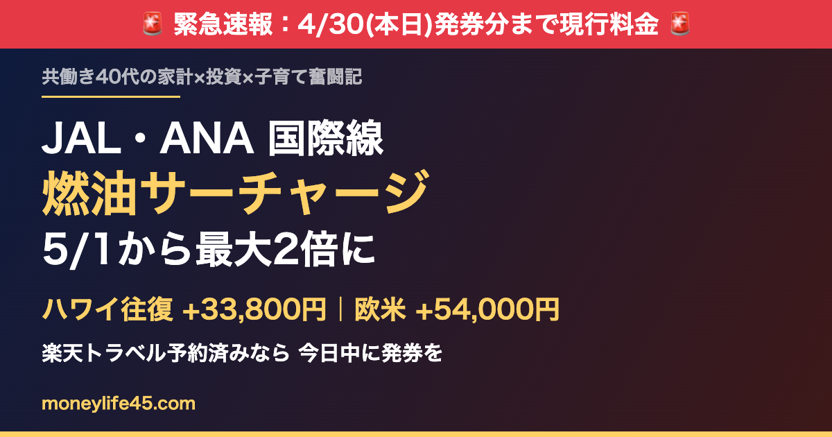 【2026年4月30日 速報】 楽天トラベル・JALパック・ANA SKY WEB等でハワイ・欧米・アジア旅行を予約済みの皆さんへ。今日中に「発券」を完了すれば、約3万円〜5万円が浮きます。5月1日(金)発券分から、JAL・ANA国際線の燃油サーチャージが大幅値上げされるためです。本記事では、値上げ幅の路線別データと、楽天トラベル予約済みの人が今日中にやるべきことを、共働き40代家計の視点で解説します。